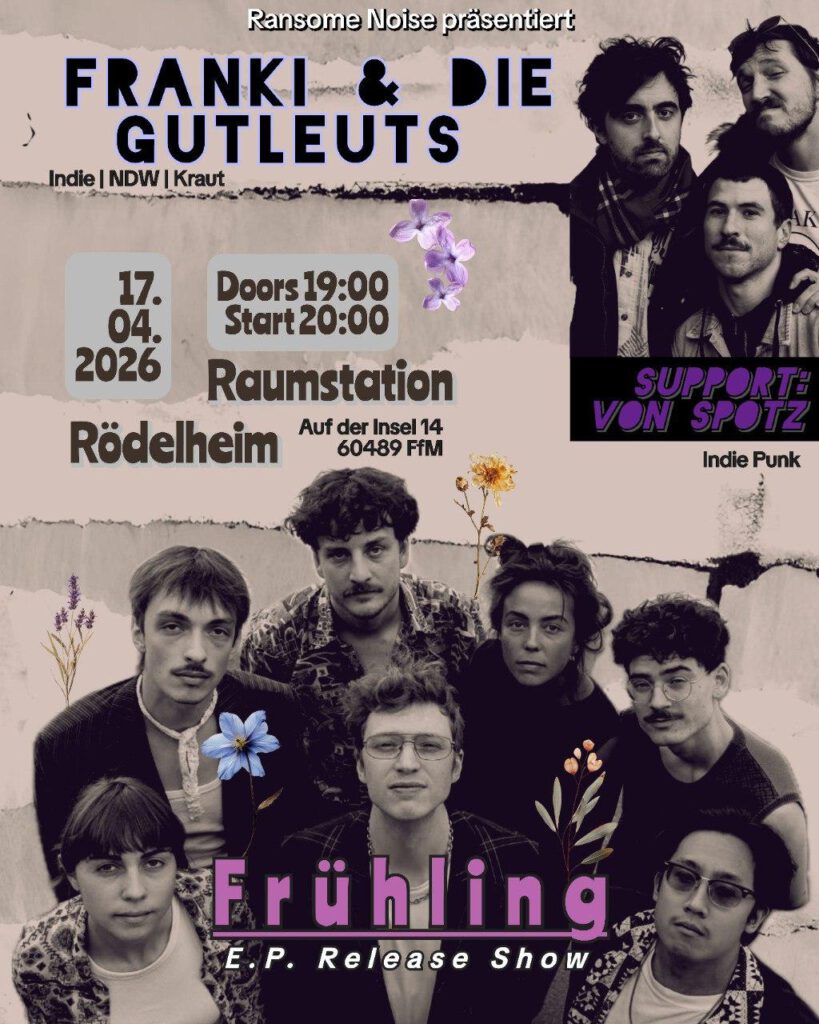 Franki und die Gutleuts präsentieren an diesem Abend ihre erste EP! Darauf zu hören ist ein buntes musikalisches Feuerwerk: Indie Kraut-rock mit süß verträumten gefühlseligen Balladen, schmissigen Tanznummern bis hin zu eskalierenden improvisierten Gitarrensolis. Dazu Orgel, Synthie und Saxophon. Mit Frankie und sechs weiteren Gutleuts wird’s auf der kleinen Raumstationbühne wieder mal ganz schön kuschelig, schön!